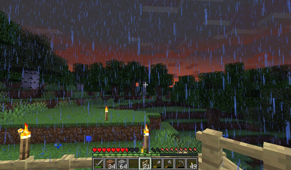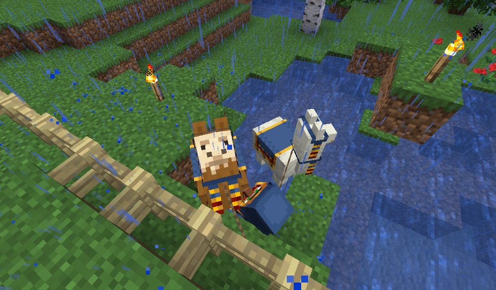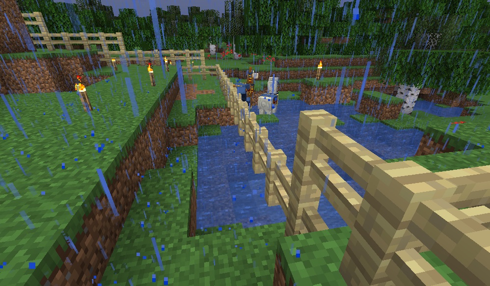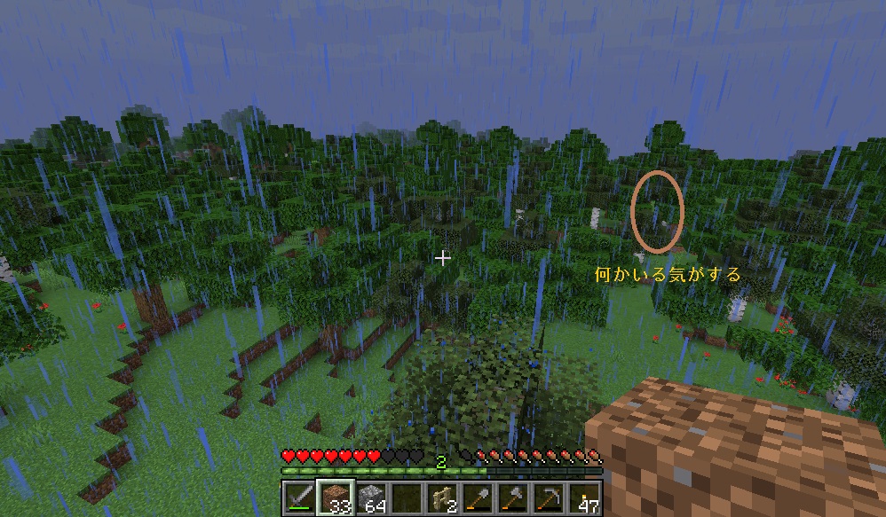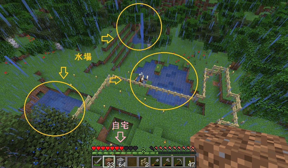 マイクライフ 6日目 雨の降る朝 マイクラ 2019年05月28日 柵で周囲を囲い終った事に安心しきって、夜中も野良仕事(敷地拡張)を続けておりましたところ、夜半から雨が降り始めました…… せっかく外で清々しい朝焼けを拝めるかと思ったのに、雨が降るとはツイてない。敷地拡張も何だかビクビクして手が進まない…… さてどうしようか。西側と南側は水場があるので、北側の森林地帯に向けて拡張を進めつつ伐採するか。 柵で周囲を囲むことに一所懸命になって、昨日は伐採とかしてないんですね。少なくとも木材が無いと生きていけない……なーんて弱気になってる場合ではない! 今できる事をやるぜ!(と言っても柵&敷地拡張)をやってると、変な声が……魔女……の声でもないし。辺りを見回してみると……ん?……んん!? 行商人&ラマ2頭がお越しになっておられました(´Д`) 水にはまってるんだけど大丈夫?? しかも柵の外だけど。中に入れてやるにも何か面倒臭いし() 行商人は自衛策が何かあるとか、ラマが主を守る為ツバを吐いて攻撃するとか、そんな情報をどこかで見たので……まぁ、放置してても大丈夫でしょう…… 自宅の近辺にはどうやら水場が3ヶ所あるらしく、念の為上から確認してみます。 西側(画像真ん中のやつ)がちょっと広い地域にある為、そこを埋め立てて敷居に組み込んでみるかなとか思ってます。一番遠い水場(画像上のやつ)付近を開墾して畑にするか。 自宅傍のやつは……うーむ、まだ使い道が思いつかないのでまだ放置で。 上から見ると、周囲地域は完全な森林地帯らしく、他のバイオームが見当たりません。確認作業中ちょっと何か見えた気もしますがキニシナイ。 と、この辺で1時間タイムアップ。続きはまた今度にします! [0回]PR
